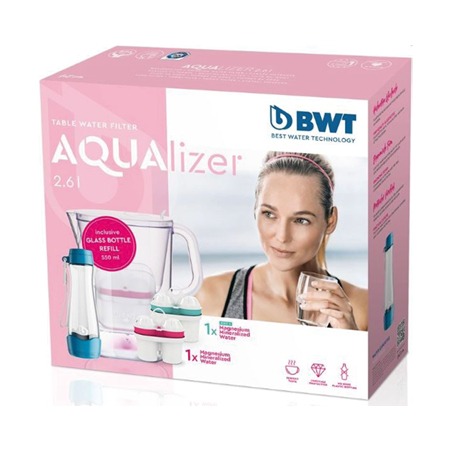 A szett tartalmaz egy BWT AQUALIZER vízszűrő kancsót, 1 db Magnesium Mineralized és 1 db Magnesium Mineralized +Zinc szűrőbetétet és egy kék BWT üveg kulacsot is.